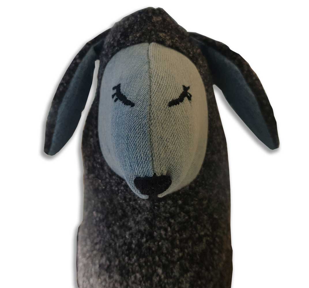 Flauschi das Schaf ist ein handgefertigtes Kuscheltier, das aus recycelter Baumwolle und Jeans-Anteilen besteht und mit Polyester gefüllt ist. Das niedliche Plüschtier ist perfekt für Kinder jeden Alters und bietet ein hervorragendes Gefühl von Weichheit und Komfort. Der Körper des Schafs ist in einem beruhigenden Grau gehalten und das Gesicht sowie die Beine bestehen aus robustem Jeansstoff.